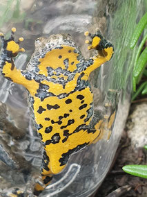Bei einem unserer jüngsten Funde konnten wir eine Gelbbauchunke (Bombina variegata) beobachten, die durch besonders viel Gelb auf ihrer Bauchseite auffällt.